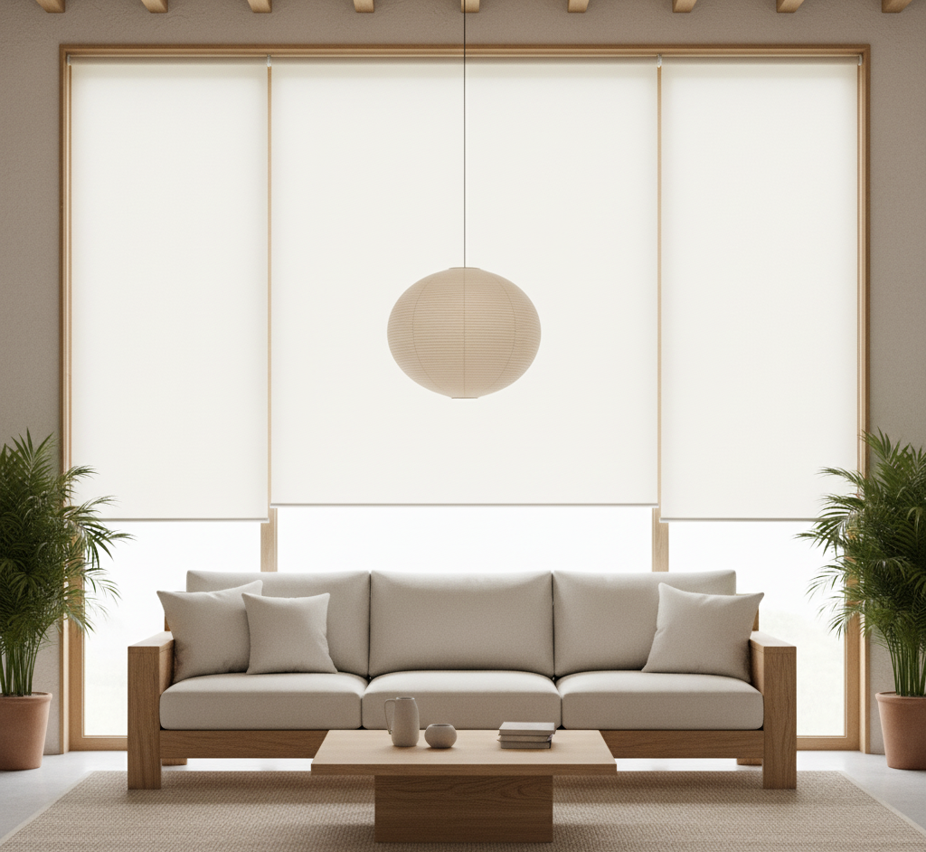 Pilihan terbaik untuk gaya Japandi adalah gorden kain linen tipis yang melayang, Wooden Blinds (tirai kayu) dengan serat kayu alami, atau Roller Blinds dengan warna earth tone polos.